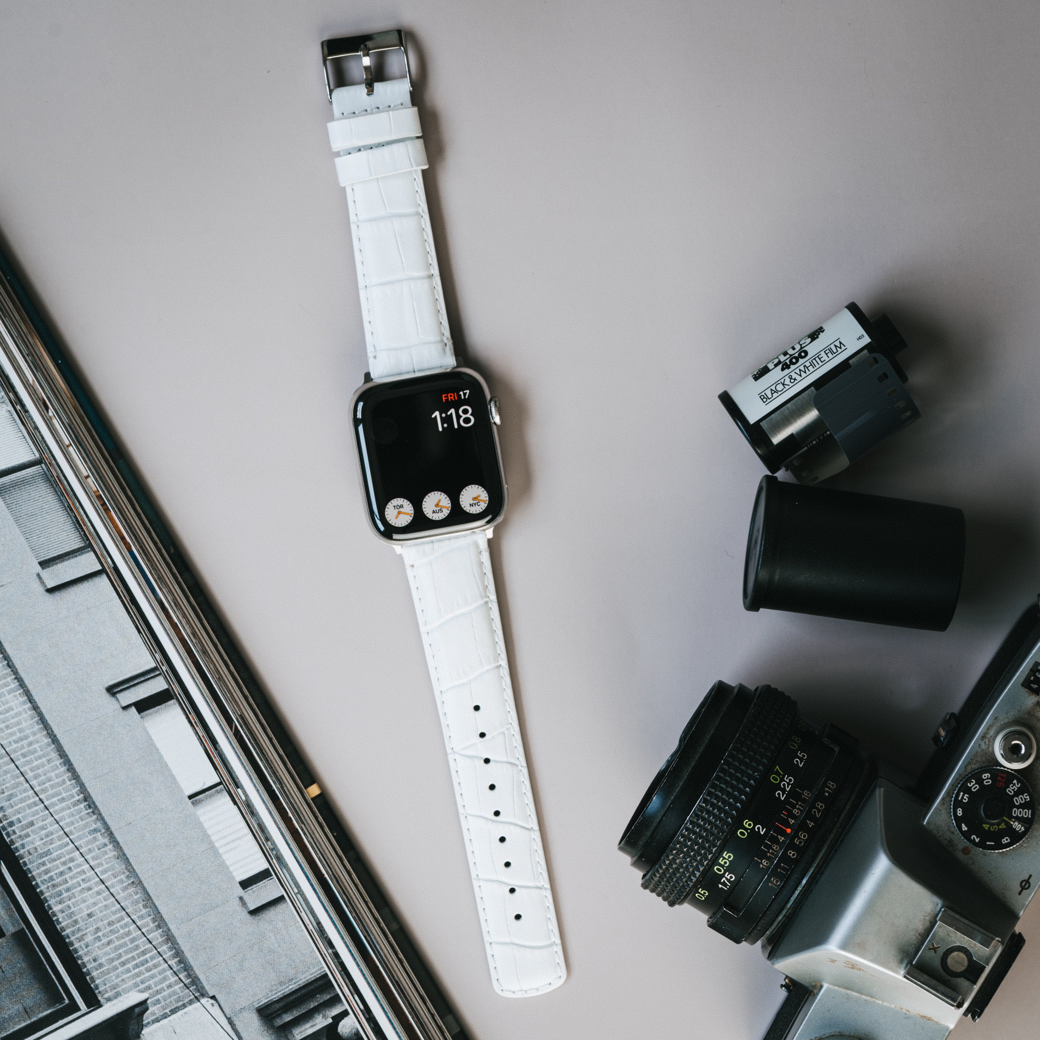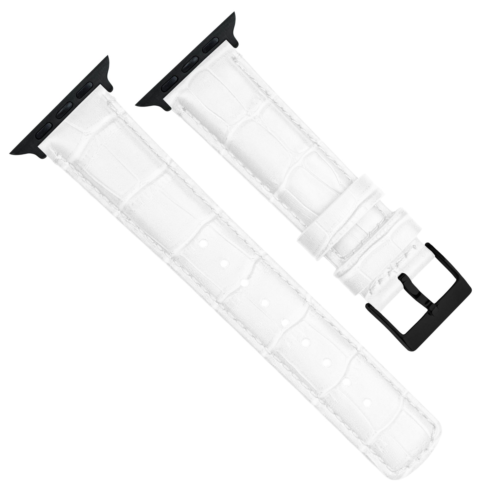 Description These white Alligator Grain Leather watch bands will take any Apple Watch to the next level. These straps are designed with a 2mm taper from watch head to buckle and...