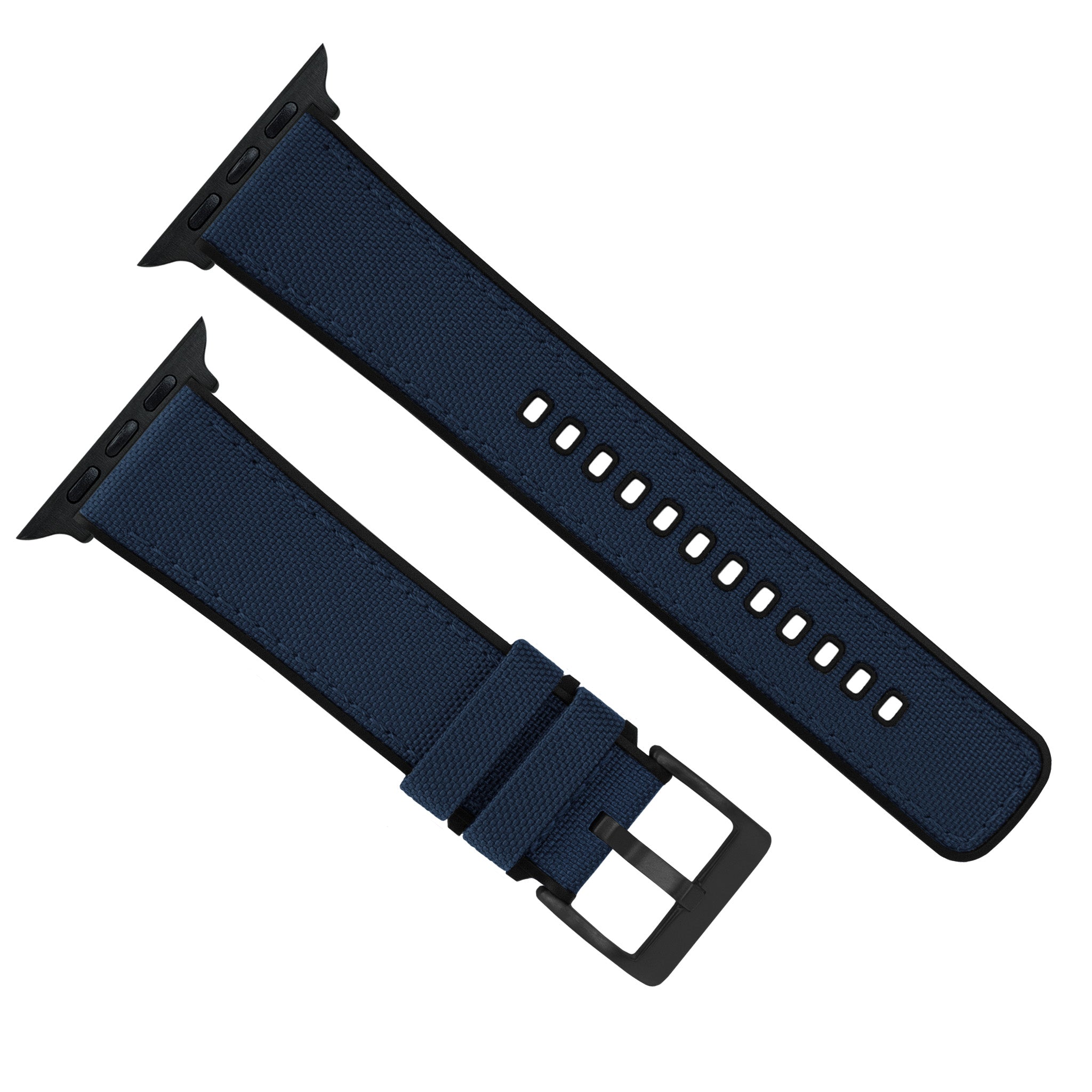 This Navy Blue Cordura Fabric and Silicone Apple Watch Band offers the best of both worlds. Engineered to be 100% waterproof, the band is perfect for year-round-wear, no matter your location. We´ve opted for the best, partnering with Cordura brand fabrics, recognized for their long-lasting durability, resistance to abrasions, and waterproof technology. Thanks to the flexible, high tensile silicone base and the 316L stainless steel hardware, the comfortable fit that keeps you coming back to BARTON prevails. Featuring silicone-lined eyelets, premium nylon stitching, and a locking keeper loop, this band is ready for action -- Whether you´re headed to a backyard BBQ or hike through Big Bend, we´ve got you covered.